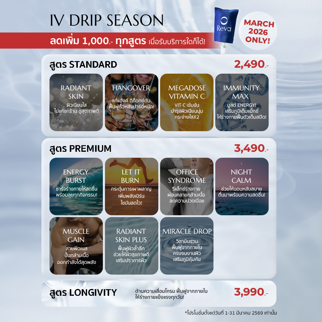 เติมอาหารผิวตรงเข้าสู่เส้นเลือดด้วยวิตามินแบบฉีด สูตรเฉพาะของ Reva เหมาะกับทุกปัญหาของแต่ละบุคคล ที่ Reva เรามีถึง 10 สูตร เพื่อตอบรับทุกปัญหาของแต่ละบุคคล